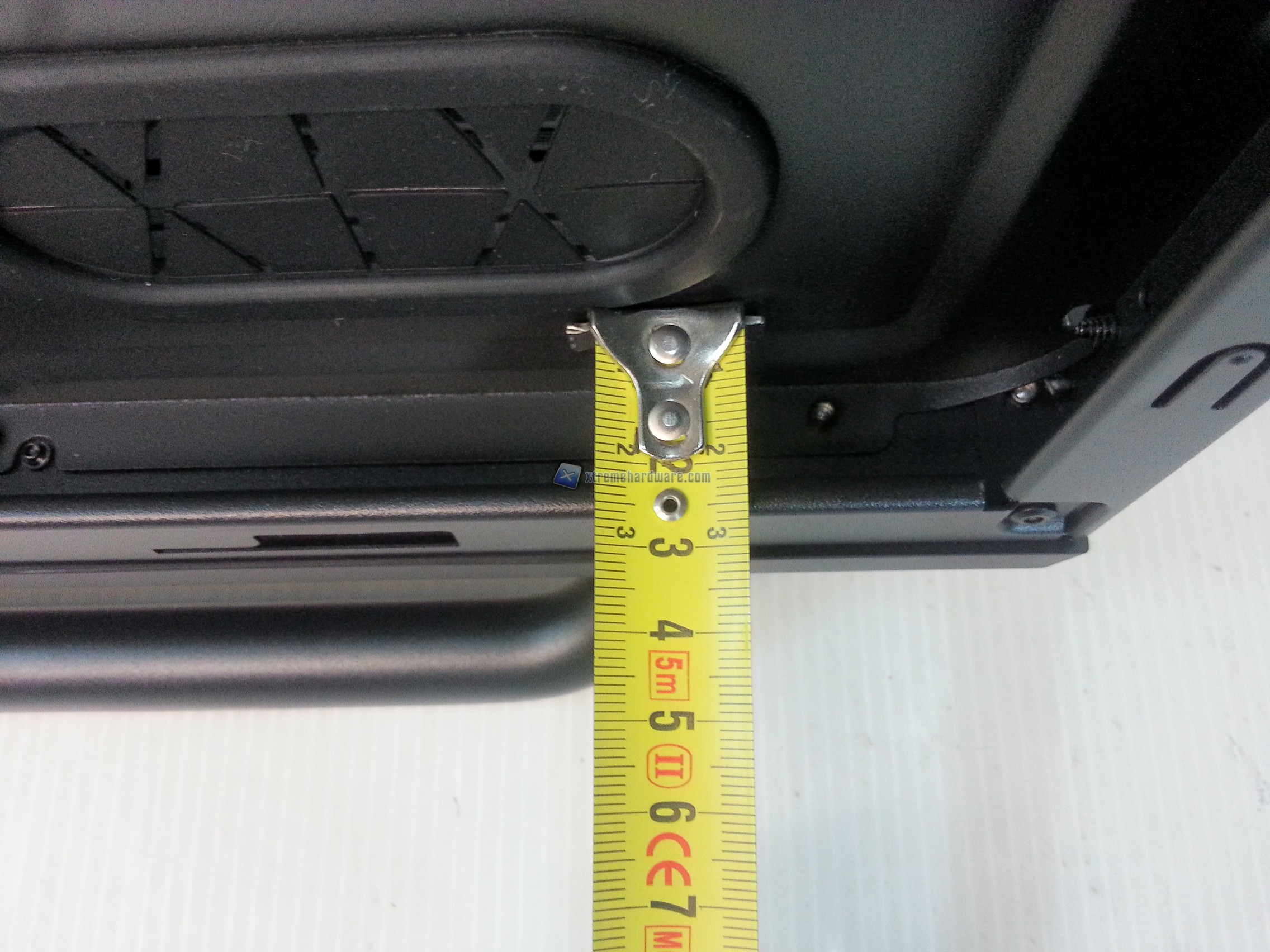 La fessura d’installazione per il backplate posteriore è molto spaziosa e permetterà tranquillamente il montaggio di dissipatori complessi. Lo spazio tra la scheda madre ed eventuali ventole superiori è buono (5.1cm !), anche se potrebbe esserci qualche complicazione con radiatori molto spessi.